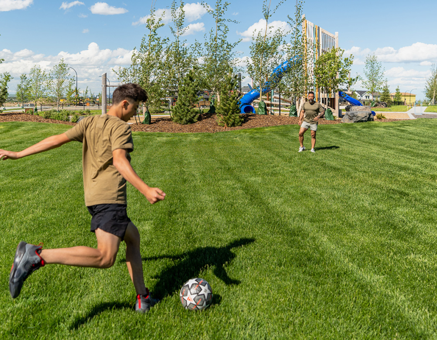 Set between Alpine Park’s unique couplet roads, which diffuses neighbourhood traffic off Stoney Trail while making it easier for residents to get around on foot, Midway Park provides a compelling urban park linkage along the treelined boulevard connecting the Village Centre to the rest of the community to the south.