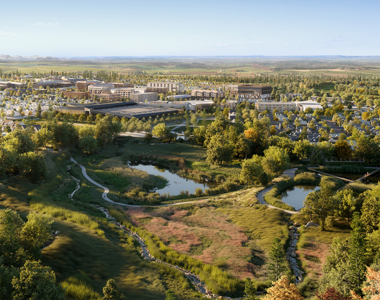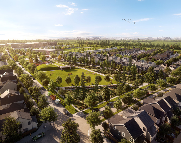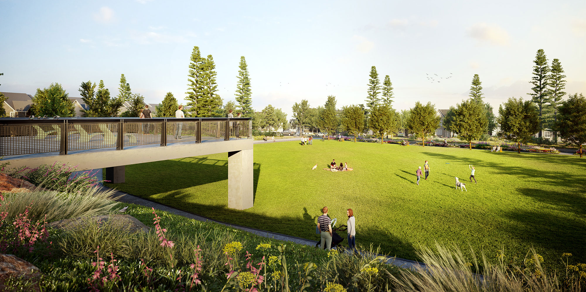 A preservation of one of the most iconic natural features of Alpine Park’s location, this 11-acre ridgeline park will protect the existing tree stand and enhance it with substantial additional plantings. A ‘canopy walk’ trail brings visitors above the treeline before dropping them into a playground nestled amongst the forest alongside a regional transecting path. A large public venue space provides wintertime tobogganing, while pavilions allow people from across the community to gather and barbeque during summers.