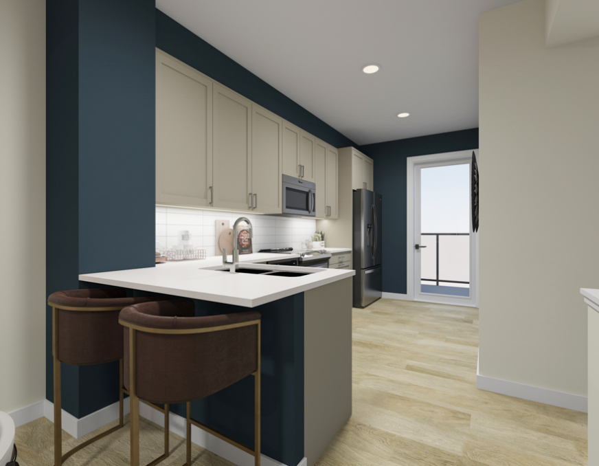 - L-shaped kitchen with quartz countertops