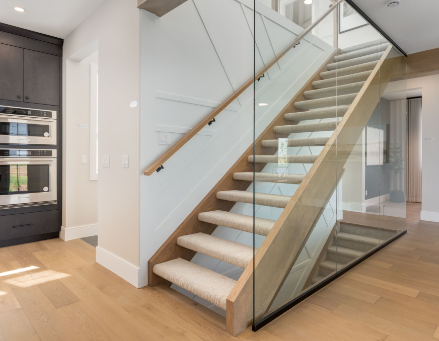 - Open staircase with glass wall to allow for light to flow through effortlessly