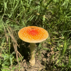 As we made our way up, we stopped occasionally to take in the scenery around us. The forest felt alive with summer. Wildflowers dotted the edges of the trail, and the most perfect little orange mushroom greeted us from the base of a tree. I believe it was a fly agaric mushroom, the kind you see in old storybooks, bright and bold, standing out vividly against the greens and browns of the forest floor